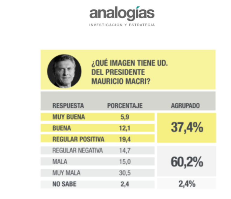 Cuando se analiza la figura del presidente, sus números son más catastróficos. El presidente tiene una imagen negativa del 60,2% y una positiva del 37,4%. Cuando se lo mide al presidente, los menores de 45 años tienen la peor imagen del presidente, mejorando en los mayores de 60 años.