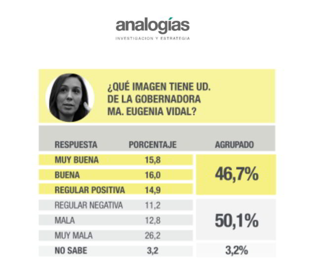 La gobernadora Vidal, que durante años mantuvo su imagen positiva, empezó a caer de forma abrupta. Hoy ya tiene un 50,1% de imagen negativa y la positiva alcanza a un 46,7%. Hay que recordar que hace unos meses su imagen positiva se acercaba al 70%. Más allá de todo, Vidal se mantiene mucho mejor que el presidente Mauricio Macri.
