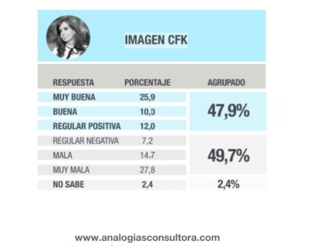 En Analogías midieron a la ex presidenta Cristina Kirchner, quien mes a mes va mejorando su imagen. Hoy un 47,9% la aprueba y un 49,7% la desaprueba pero hay que recordar que en abril, la ex presidenta tenía un 44,2% de positiva y un 55,3% de negativa.