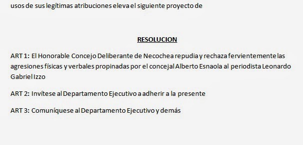 ART 1: El Honorable Concejo Deliberante de Necochea repudia y rechaza fervientemente las agresiones físicas y verbales propinadas por el concejal Alberto Esnaola al periodista Leonardo Gabriel Izzo