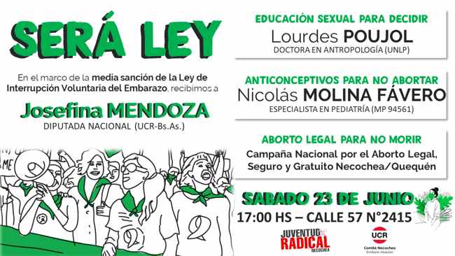 Con la presencia de la Diputada Nacional Josefina Mendoza (UCR Buenos Aires), la Juventud Radical invita a toda la comunidad a dialogar acerca de los avances obtenidos con la media sanción de la Ley de Interrupción Voluntaria del Embarazo, aprobada en la Honorable Cámara de Diputados de la Nación en la madrugada del pasado jueves 14.