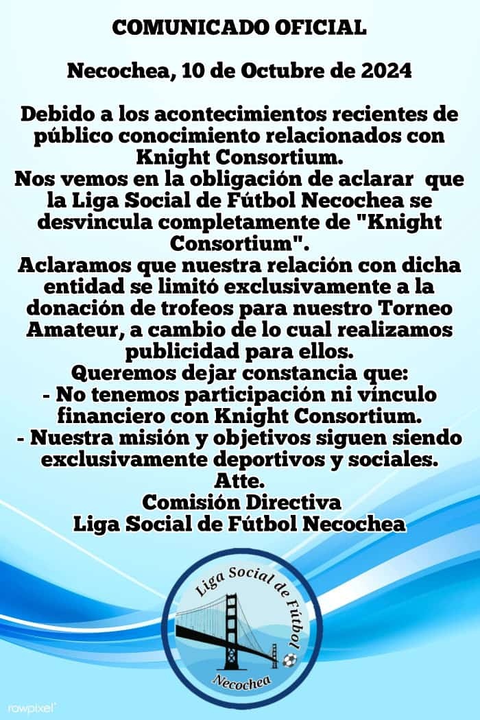 La Liga Social de Fútbol Necochea se desvincula de Knight Consortium tras recientes acontecimientos
