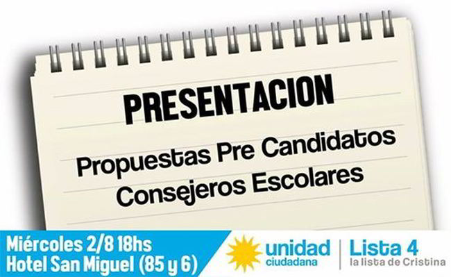 La Lista 4 de Unidad Ciudadana que encabeza Andrea Cáceres, presentará las propuestas educativas que impulsa el espacio que representa a nivel local y que lleva a Cristina Fernández de Kirchner como precandidata a senadora nacional. El encuentro tendrá lugar en el Hotel San Miguel ubicado en calle 85 N° 301 este miércoles 2 de agosto, a las 18 hs.