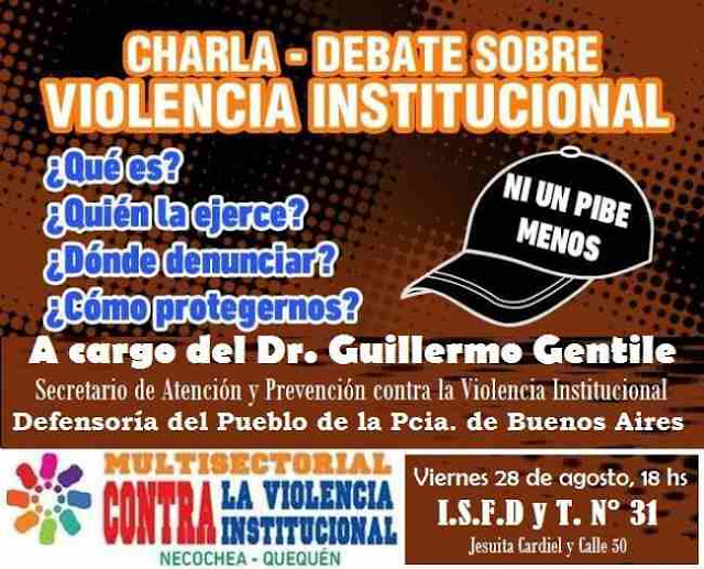 La Multisectorial contra la Violencia Institucional Necochea-Quequén, tiene el agrado de invitar a toda la comunidad a la charla/debate que se realizará este viernes 28 de agosto, a las 18:00 hs, a realizarse en las instalaciones del I.S.F.D. y T. Nª 31, ubicado en Av. Jesuita Cardiel y calle 50. Dicha charla estara a cargo del Dr. Guillermo Gentile, Secretario de Atención y Prevención contra la Violencia Institucional de la Defensoría del Pueblo de la Provincia de Buenos Aires. La Violencia Institucional vulnera los derechos de todos, pero en particular de los grupos más excluidos y/o minoritarios, por eso es necesario saber que es, como se manifiesta, quien la ejerce, donde denunciar y como protejernos.