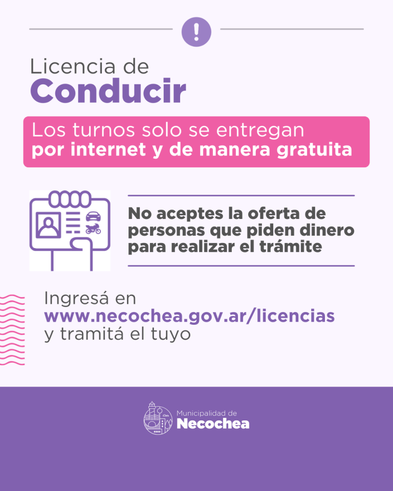 Habiendo detectado la oferta no autorizada de personas ajenas al municipio que ofrecen gestionar turnos para la obtención de licencias de conducir, la Municipalidad de Necochea recuerda a los vecinos y vecinas que el trámite de turnos se realiza únicamente de manera online y de forma gratuita.