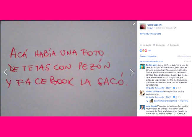 Luego de la nota en televisión, la cuenta de la actriz fue censurada por Facebook, lo mismo que una nota de Rosario 12 donde se la veía pechos al viento y manos en alto.