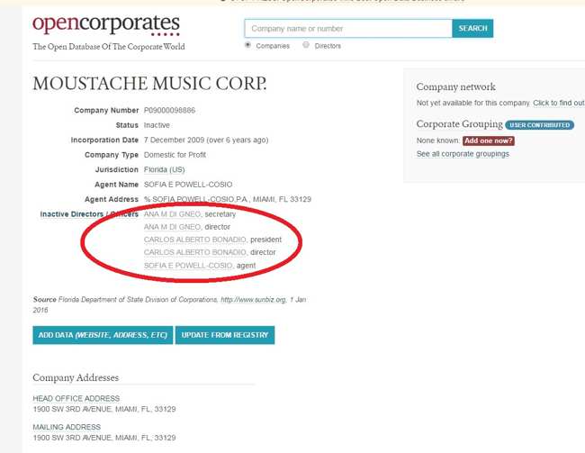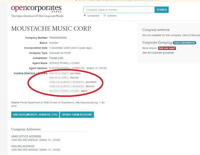 De fuentes oficiales, minutouno.com supo que la sociedad Moustache Music Corp., con domicilio en Florida, EEUU, está a nombre del hermano y socio del juez federal, Carlos Alberto Bonadio, y de su esposa Ana María Di Gneo. Ambos figuran como directores de la compañía que no estaría radicada en la Argentina. Este tipo de sociedades generalmente no están debidamente declaradas cuando tienen por objetivo el lavado de dinero u otro tipo de prácticas financieras ilegales.