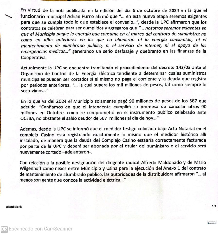 En virtud de la nota publicada en la edición del dia 6 de octubre de 2024 en la que el funcionario municipal Adrian Furno afirmó que “… en esta nueva etapa seremos exigentes para que se cumpla todo lo que establece el convenio…”, desde la UPC afirmaron que los contratos se celebran para ser cumplidos y agregaron que “… nosotros seremos exigentes en que el Municipio pague la energía que consume en el marco del contrato de suministro; no como en años anteriores en los que no abonaron ni la energía consumida, ni el mantenimiento de alumbrado publico, ni el servicio de internet, ni el apoyo de las emergencias medicas…” generando un serio desfasaje y quebranto en las finanzas de la Cooperativa.