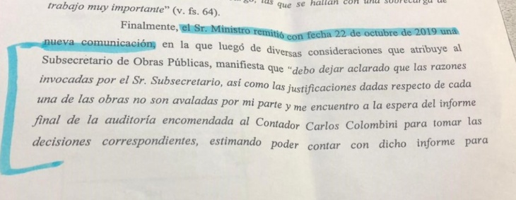 “Debo dejar aclarado que las razones invocadas por el Sr. Subsecretario, así como las justificaciones dadas respecto de cada una de las obras no son avaladas por mi parte y me encuentro a la espera del informe final de la auditoría encomendada al contador Carlos Colombini para tomar las decisiones correspondientes”, escribió.