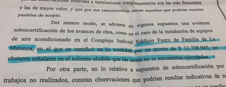 Uno de los casos se encuentra en La Matanza. Se trata de la obra del complejo del Edificio Fuero de Familia, que se certificó en su totalidad por 11.738.945 pesos a pesar de que “las tareas no se encuentran ejecutadas”, según el informe que sustenta la denuncia. En esa obra se puede analizar el “modus operandi” del presunto desfalco al que se somete al Estado.