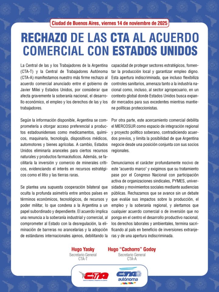 Las conducciones de la CTA de los Trabajadores (CTA-T) y la CTA Autónoma (CTA-A) expresaron un rechazo categórico al acuerdo comercial anunciado por el gobierno de Javier Milei con Estados Unidos. Ambas centrales sindicales alertaron que el entendimiento “afecta gravemente la soberanía nacional, el desarrollo económico y los derechos laborales”, y reclamaron que cualquier avance sea debatido en el Congreso con participación de actores sociales y productivos.
