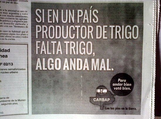 Hoy, la entidad dice en la solicitada «Si en un país productor de trigo falta trigo, algo anda mal. Para andar bien, votá bien. CARBAP. Con los pies en la tierra».