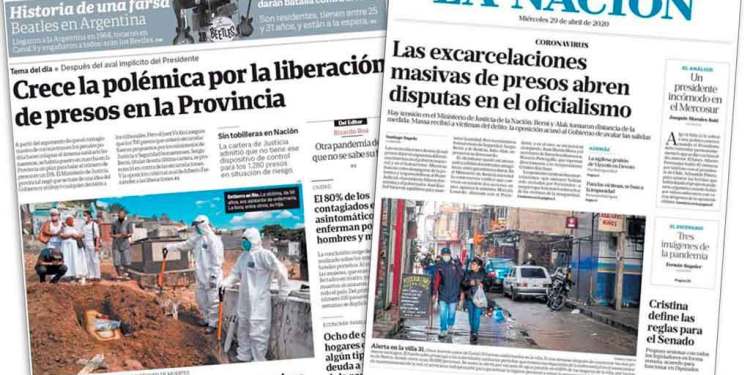 Sin embargo, mientras se enviaba genocidas a su casa y el hecho no se consideraba noticia para la mayoría de los medios, la comunicación concentrada denunció “un plan del gobierno para sacar presos” (Clarín el 29 de abril de 2020). “Liberación de presos: otra pandemia de la que no se sabe su final. El virus se mezcló con la política y sirve de excusa para sacar presos casi al voleo”, tituló el día después de haber sostenido “Coronavirus en Argentina: el mecanismo, cómo es el plan para excarcelar a 6.000 presos en la Provincia” (Clarín, 28 de abril de 2020).