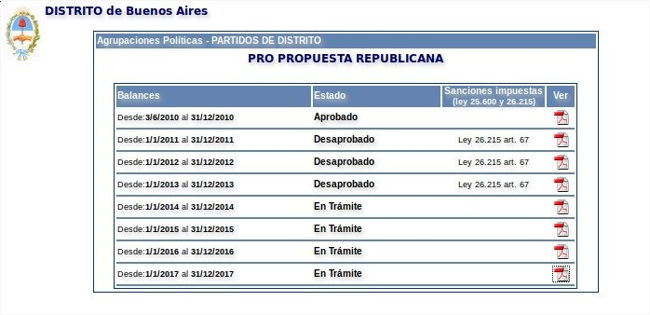 En 2017, además, el PRO bonaerense tuvo multas por cerca de 1.200.000 por presentar mal los balances de 2015. Para completar el círculo, también según la Cámara Nacional Electoral, el PRO bonaerense no informó el responsable de financiamiento de campaña.