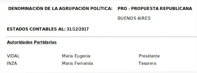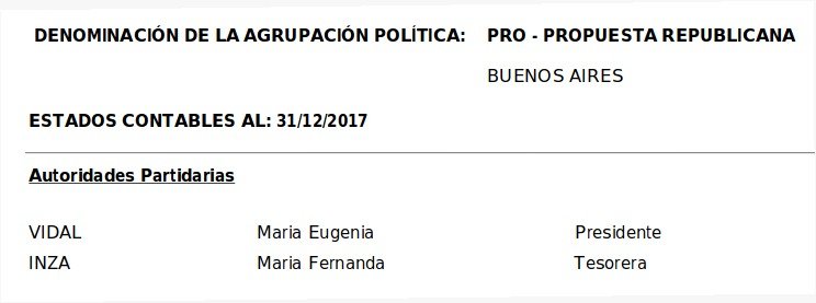 La cadena de responsabilidades en torno al financiamiento de la campaña 2017 es la siguiente. Vidal es la presidenta del PRO en la provincia de Buenos Aires. Esto consta en los balances del partido y en las actas presentadas ante la Justicia Electoral.