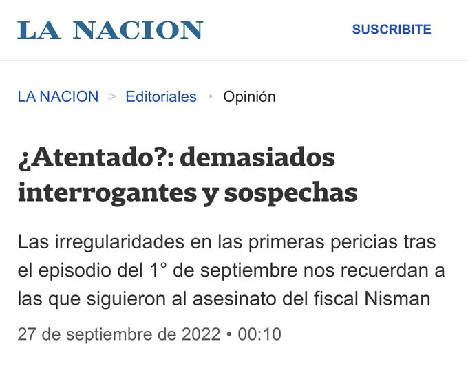 En su edición impresa del martes bajo el título “¿Atentado?: demasiados interrogantes y sospechas”, la nota de La Nación sostenía en el copete que “las irregularidades en las primeras pericias tras el episodio del 1 de septiembre nos recuerdan a las que siguieron al asesinato del fiscal Nisman“.