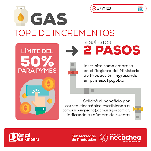 La Subsecretaría de Producción de la Municipalidad de Necochea informa a propietarios de pequeñas y medianas empresas del Distrito que la firma distribuidora de gas a nivel zonal dispuso un límite de incremento del 50% en el valor de la tarifa, en el marco de las disposiciones vigentes.