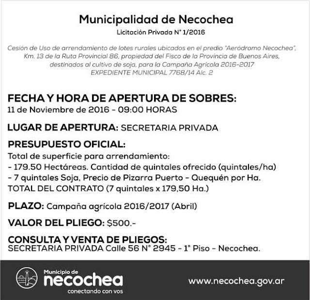 La Secretaría Privada del Municipio, a cargo de Marcelo Ansean, realiza el llamado a Licitación Privada por Cesión de Uso de arrendamiento de lotes rurales en el predio “Aeródromo Necochea”, en el kilómetro 13 de la Ruta Provincial 86, propiedad del Fisco de la Provincia de Buenos Aires.