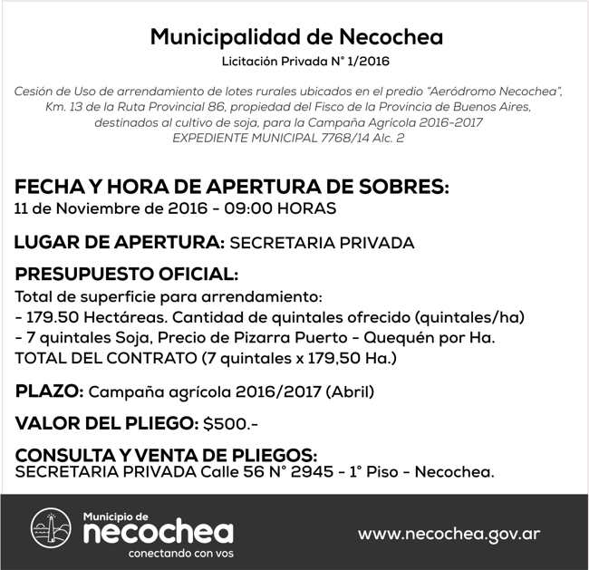 La Secretaría Privada del Municipio, a cargo de Marcelo Ansean, realiza el llamado a Licitación Privada por Cesión de Uso de arrendamiento de lotes rurales en el predio “Aeródromo Necochea”, en el kilómetro 13 de la Ruta Provincial 86, propiedad del Fisco de la Provincia de Buenos Aires.