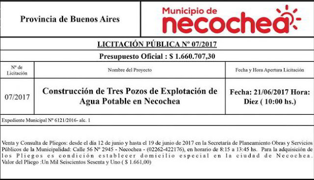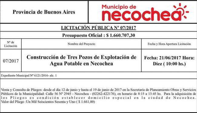 La Secretaría de Planeamiento, Obras y Servicios Públicos lanzó un nuevo llamado a Licitación Pública, bajo el N° 07/2017, para la construcción de tres pozos de explotación de agua potable en la ciudad de Necochea.