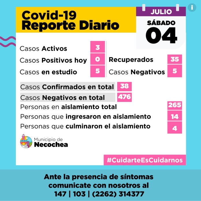 En tanto siguen siendo 3 los casos activos en la ciudad, 38 desde que comenzó la pandemia, de los cuales se recuperaron 35 y 476 los casos sospechosos que arrojaron resultados negativos. Hay 5 casos sospechosos en estudio.