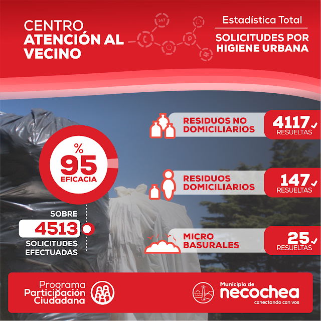 Con una eficacia superior al 95%, la mayor parte de los pedidos que llegan al Centro de Atención al Vecino, referidos a este ítem, responden a residuos no domiciliarios; mientras que también surgen reclamos por microbasurales y residuos domiciliarios en un menor promedio.
