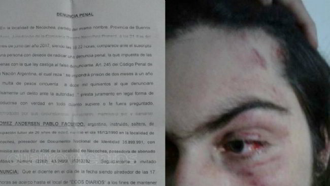 Cuando la policía llegó al lugar, el «borracho» contó lo sucedido y elevó la denuncia contra Ignacio, relatando que recibió rodillazos en la cara y la cabeza, además de golpes de puño por haber pedido el pago de la deuda. El joven fue revisado por doctores de la policía que constataron las lesiones.