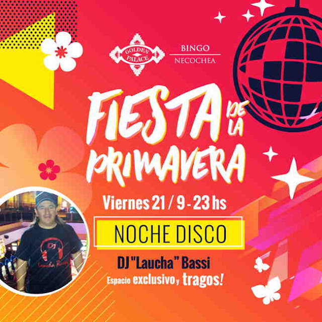 Llegó la primavera y queremos que te diviertas a lo grande! Es por eso que en Bingo Golden Palace te invitamos esta noche, a partir de las 23hs, a vivir una verdadera “FIESTA DISCO” de la mano del reconocido DJ “Laucha” Bassi.