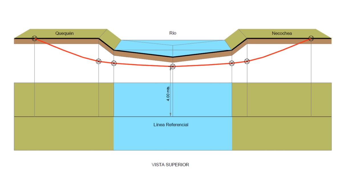 EL ELECTRODUCTO A CONSTRUIR SE DISPONDRÁ POR MEDIO DE TUNELACIÓN DIRIGIDA Y ENCAÑADO DE LA INSTALACIÓN CON TRES CAÑOS DE PEAD DE 200 MM. PN 12,5 Y UN CAÑO DE PEAD DE 50MM.PN10, LOS CUALES EN FORMA SUBTERRÁNEA DEBERÁN ATRAVESAR EL RÍO QUEQUÉN A UNA PROFUNDIDAD ESTIMADA MÍNIMA DE CUATRO METROS (4M) POR DEBAJO DEL CENTRO DEL CAUCE DEL RÍO.