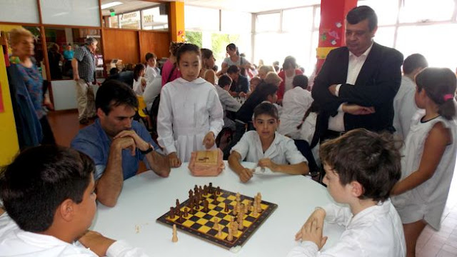 Luego de dirigirse a los presentes, López participó de una partida distendida con uno de los alumnos del colegio.