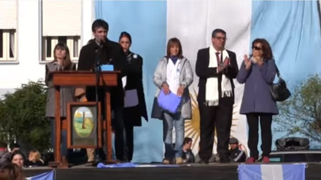El intendente Dr. Facundo López se dirigió a los presentes en el acto oficial por el Día de la Bandera, que se desarrolló ante una multitud en la Plaza Dardo Rocha y con 1200 alumnos de cuarto año de la escuela primaria que hicieron la promesa a la insignia patria.