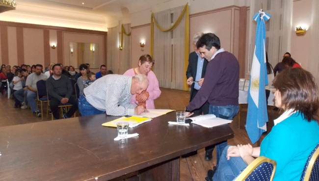 Acto seguido se firmaron de manera protocolar entre el intendente López y el escribano Berterretche escrituras para los vecinos Carlos Alvarengo y Gloria Suárez como también para Atilio Tillous y María Ester Escudero, mientras que después se completó la nómina de 37.