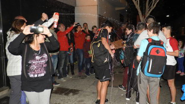 La espuma artificial para recibir a los campeones de hándbol Sub 14 escolar, elenco de Alta Mira.