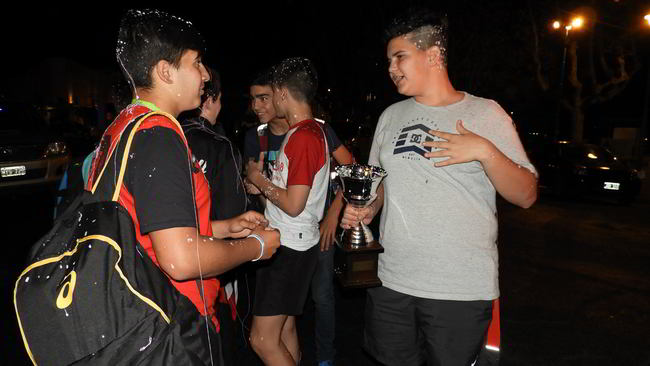 La espuma artificial para recibir a los campeones de hándbol Sub 14 escolar, elenco de Alta Mira.