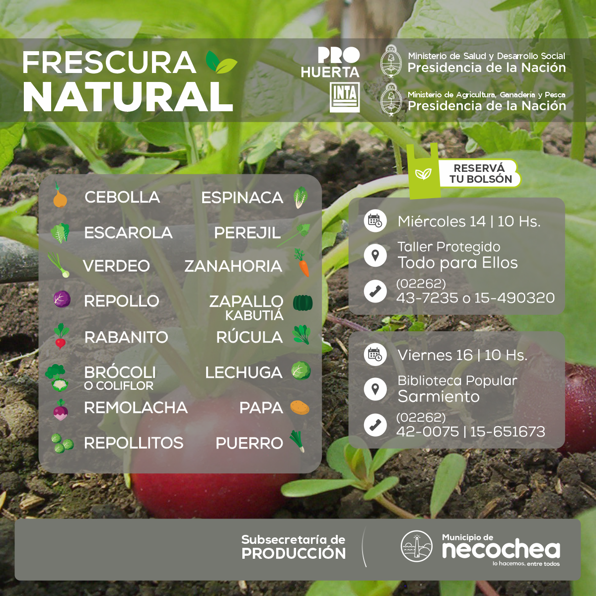 Vale recordar que esta propuesta promotora de la economía social es impulsada por el municipio, a través de la Subsecretaría de Producción, en un trabajo conjunto con los anexos locales de Senasa e Inta, con el apoyo del programa ProHuerta de los ministerios nacionales de Salud y Desarrollo Social y de Producción y Trabajo.