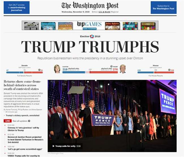 El prestigioso diario abre la edición de hoy con un contundente título: «Trump triunfa». Haciéndose eco de la sorpresa que sacudió a una gran parte del país y al mundo entero, el periódico arranca la nota así: «Donald Trump fue elegido como el 45to presidente de la nación en un impresionante final de campaña que desafió las expectativas y las convenciones en todo punto y en un fuerte repudio de los estadounidenses al status quo».