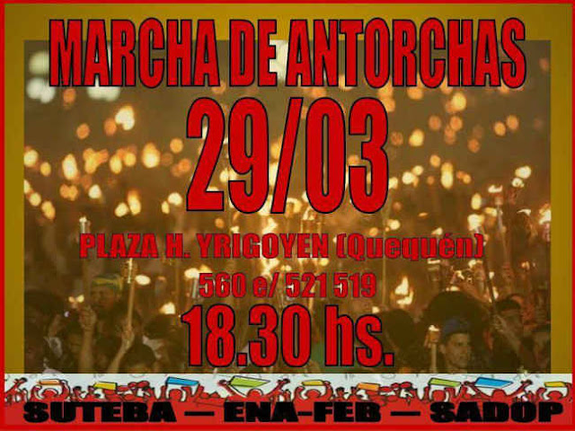 En este marco, los sindicatos, a través de sus afiliados, acordaron mantenerse en estado de alerta y movilización, convocando a nivel distrital a una marcha de antorchas en defensa de la escuela pública a realizarse el miércoles 29 de marzo. El lugar de concentración será la plaza de Quequén ubicada en calle 560 entre 521 y 519, a partir de las 18:30 horas.