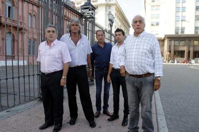 Los sindicalistas Juan Carlos Schmid (Fempinra), Omar Maturano (La Fraternidad), Omar Pérez (camioneros), Juan Pablo Brey (aeronavegantes) y Mario Caligari (UTA) se presentaron en Casa Rosada este lunes para insistir en su reclamo contra lo que consideran un «impuesto al trabajo».