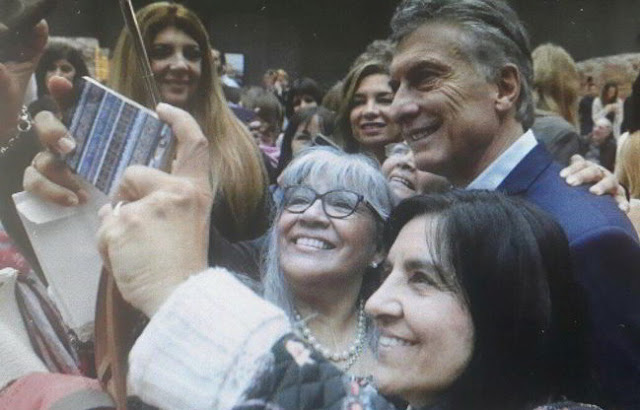 En esta foto se puede ver a Madres del dolor, Once y Cromagnon sacandose «selfies» con Mauricio Macri.