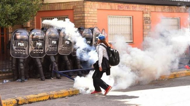 Rápidamente, uniformados de la Policía de Río Negro y de Seguridad Aeroportuaria reprimieron con balas de goma y gases lacrimógenos a los manifestantes y los trabajadores de prensa que se encontraban cubriendo la noticia. Según el medio La retaguardia, detuvieron a nueve integrantes de la comunidad.