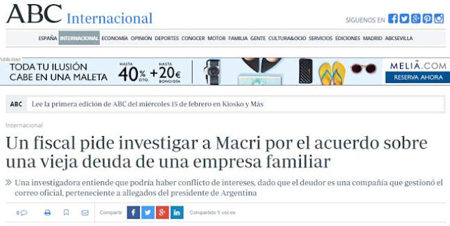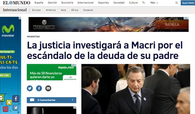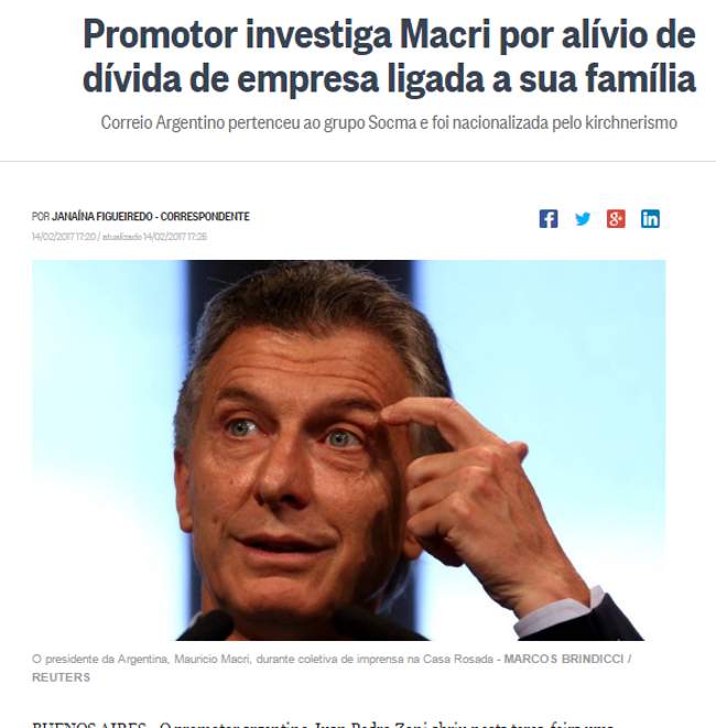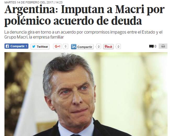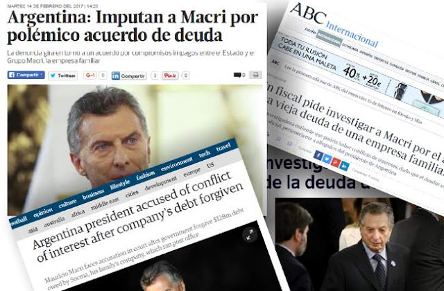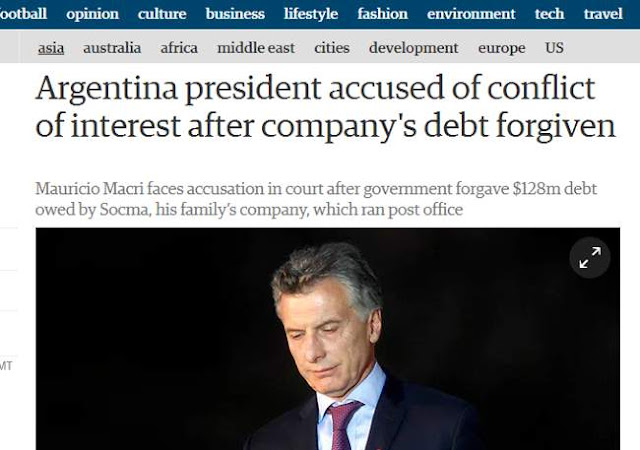 El presidente Argentino Mauricio Macri ocupa un lugar en los principales diarios del mundo, por haberse auto-perdonado una deuda de su empresa “Correo Argentino” equivalente a unos $70.000 miillones de pesos.