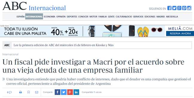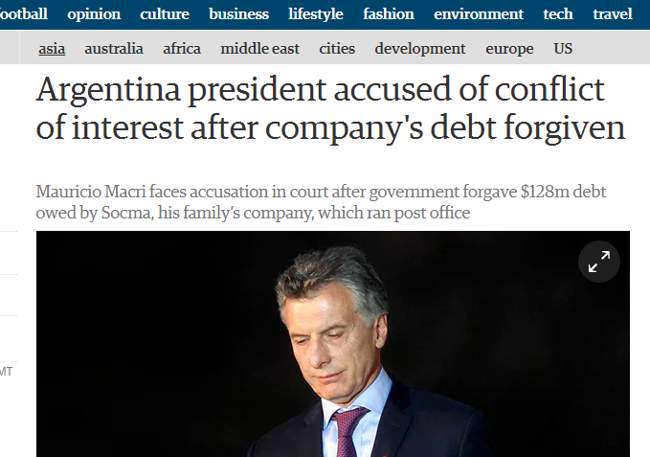 El prestigioso Diario Británico, “The Guardian” publica en su portada princial la foto del presidente, Mauricio Macri y titula “Presidente de Argentina acusado de conflicto de interés después de la deuda de la compañía perdonado”.