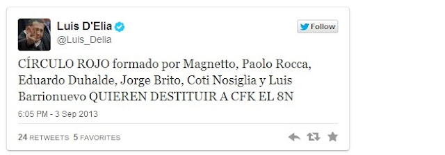 Por su parte, el dirigente kirchnerista Luis D´Elía utilizó su cuenta de Twitter para declarar: «CÍRCULO ROJO lo forman Magnetto, Paolo Roca, Eduardo Duhalde, Jorge Brito, Coti Nosiglia y Luis Barrionuevo QUIEREN DESTITUIR A CFK».