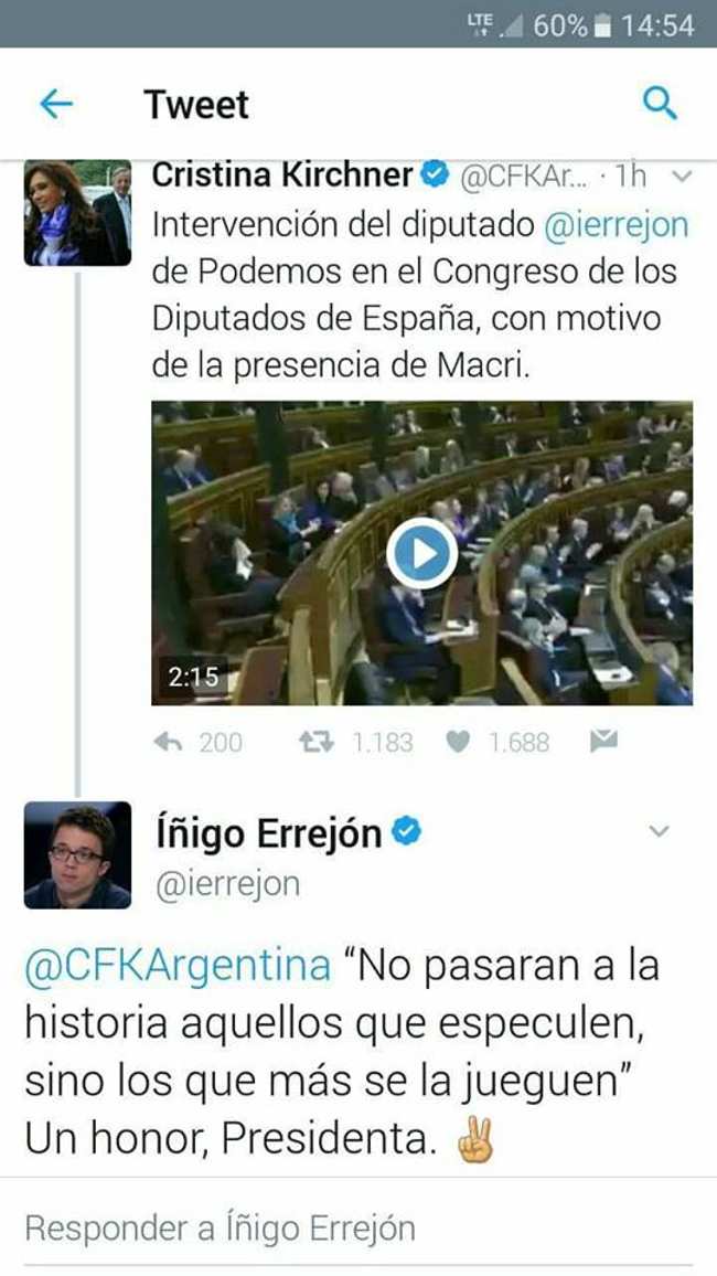 En medio de una sesión en el Parlamento, el legislador por Podemos, Íñigo Errejon, aprovechó para disparar contra Mauricio Macri, que se encontraba de visita en el país. El diputado resaltó “la importancia de estrechar lazos con Argentina» a pesar de que el Presidente “es del mismo bando que el Gobierno Español.