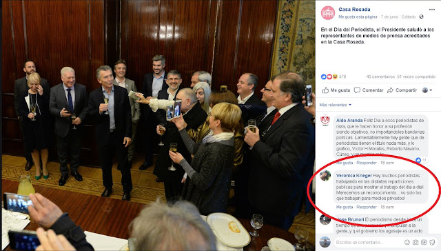 El 7 de junio pasado, Día del Periodista, Macri subió a la cuenta oficial de Presidencia, una foto con un brindis realizado junto a los colegas de medios acreditados en Casa Rosada. En esa oportunidad, desde su perfil, Verónica escribió: