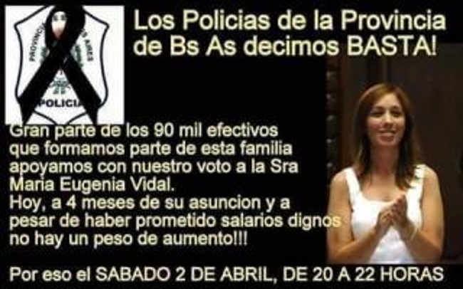 La Policía de la provincia de Buenos Aires anunció un paro para el sábado 2 de abril en reclamo de mejoras salariales. La novedad fue anunciada a través del grupo de Facebook «Policías reclamando», donde llamaron a los efectivos a adherir a la medida de fuerza.