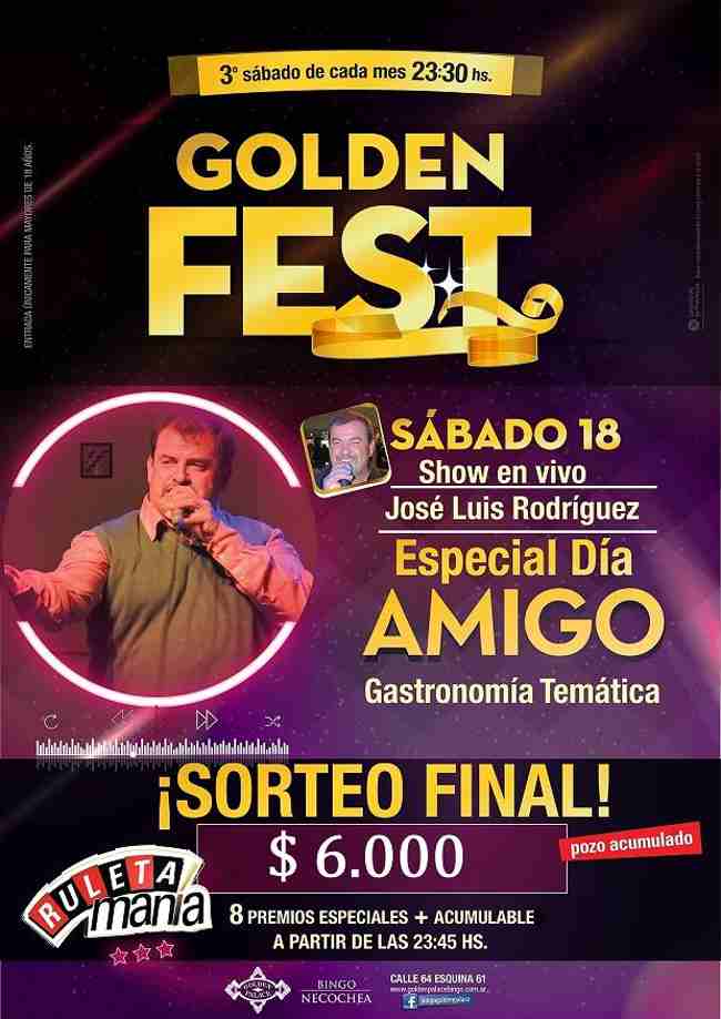 MAÑANA, Sábado 18 de julio a partir de las 23.30 hs, Bingo Golden Palace homenajeará de forma anticipada a todos los “Amigos”, con show de Música Festiva a cargo de “Jose Luis Rodriguez”, gastronomía temática y sorteos por premios de los comercios “Médano Blanco – Termas del Campo”, “Bonitas Martul” La Perfumería, “Bazar Americano”, “Frida” Bijou, “Lourdes” Papelera y cotillón.