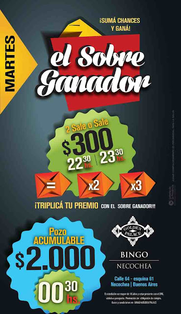 Los Martes en Bingo Golden Palace ubicado en calle 61 esquina 64 de Necochea, el público puede disfrutar de una variedad de promociones especiales y premios acumulados, con entrada general sin cargo para mayores de 18 años.