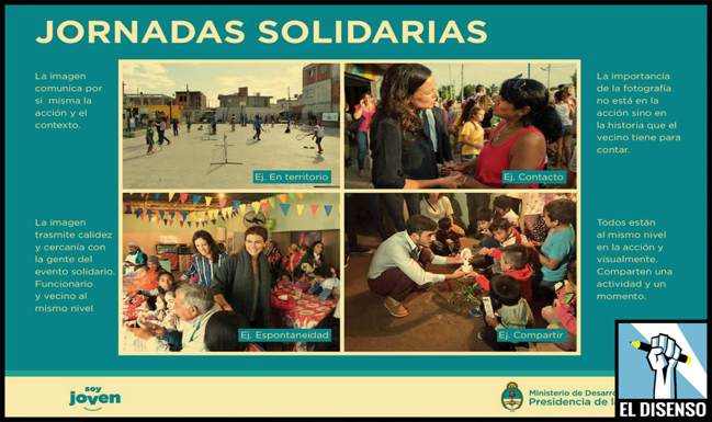 EN TUS SESIONES DE FOTOS NUNCA, PERO NUNCA, TE MUESTRES MIENTRAS HACES DONACIONES DIRECTAS. ¿NO ENTENDÉS POR QUÉ, PIPIOLO? NO IMPORTA, CONFIÁ EN EL MANUAL ROBLEDO DE FOTOGRAFÍA , MIENTRAS TANTO, POR ATRÁS DE LOS MONTAJES SOLIDARIOS, HACEMOS CLIENTELISMO REPARTIENDO MERCADERÍA SIN QUE NADIE SE DE CUENTA. NO TE OLVIDES QUE ESTE MANUAL LLEVA MEMBRETE DE DESARROLLO SOCIAL, Y ENTREGAR LA CAJA DEL GOBIERNO COMO DONACIÓN PARTIDARIA ESTA MAL VISTO.
