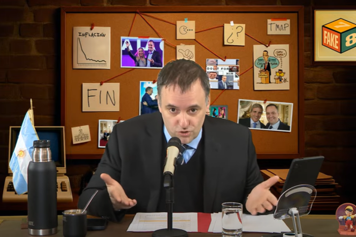 Hace poco más de un mes lanzó Fake 7,8, un ciclo semanal en su canal de YouTube donde, cada viernes, presenta un resumen audiovisual de lo que él considera “noticias falsas” y “calumnias” sobre medidas o acciones del Gobierno nacional. Sin embargo, el programa derivó en un escándalo cuando se conoció que el canal ofrecía membresías pagas de $1.000 que incluían acceso anticipado a videos, prioridad para recibir respuestas en el chat y “insignias de lealtad” junto al nombre del usuario. Esto implicaba que Adorni percibía ingresos extra, por fuera de su salario como funcionario, en contravención a la ley de ética pública.